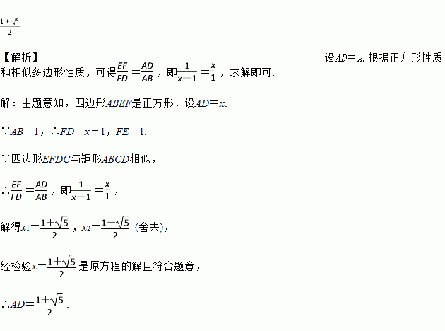 如图,已知矩形ABCD中,AB=1,在BC上取一点E,沿AE将△ABE向上折叠,使点B落在AD上的点F处.若四边形EFDC与矩形ABCD相似,求AD的长.