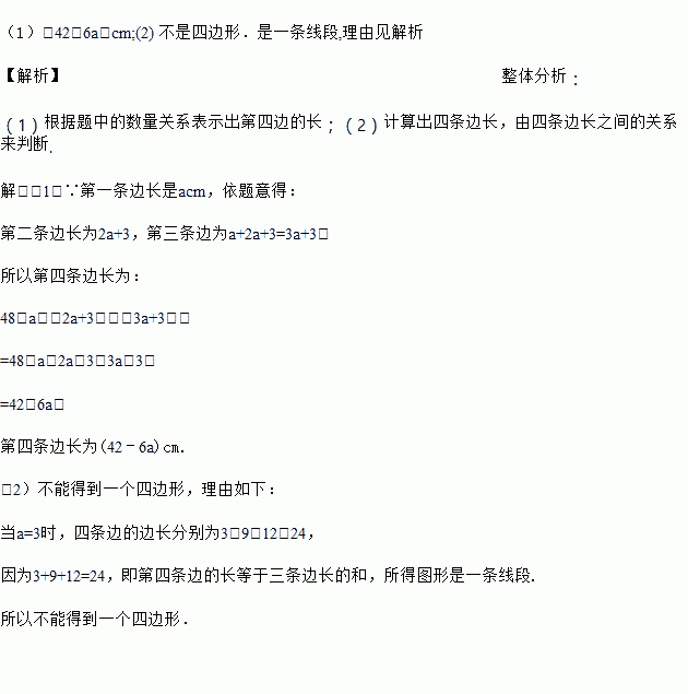 一个四边形的周长为48cm,已知第一条边长acm,第二条边比第一条边的2倍长3cm,第三条边等于第一,第二两条边的和.