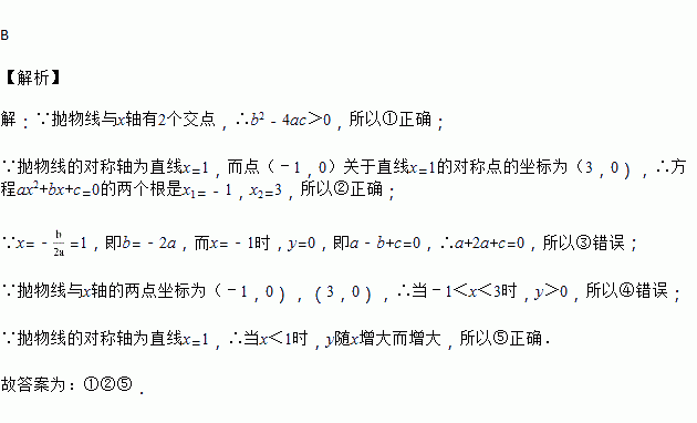 如图,抛物线y=ax2+bx+c(a≠0)的对称轴为直线x=1,与x轴的一个交点坐标为(-1,0),其部分图象如图所示,下列结论:①4ac<b2;②方程ax2+bx+c=0的两个根是x1=-1,x2=3;③3a+c>0;④当y>0时,x的取值范围是-1≤x<3;⑤当x<0时,y随x增大而增大.其中结论正确的个数是( )
