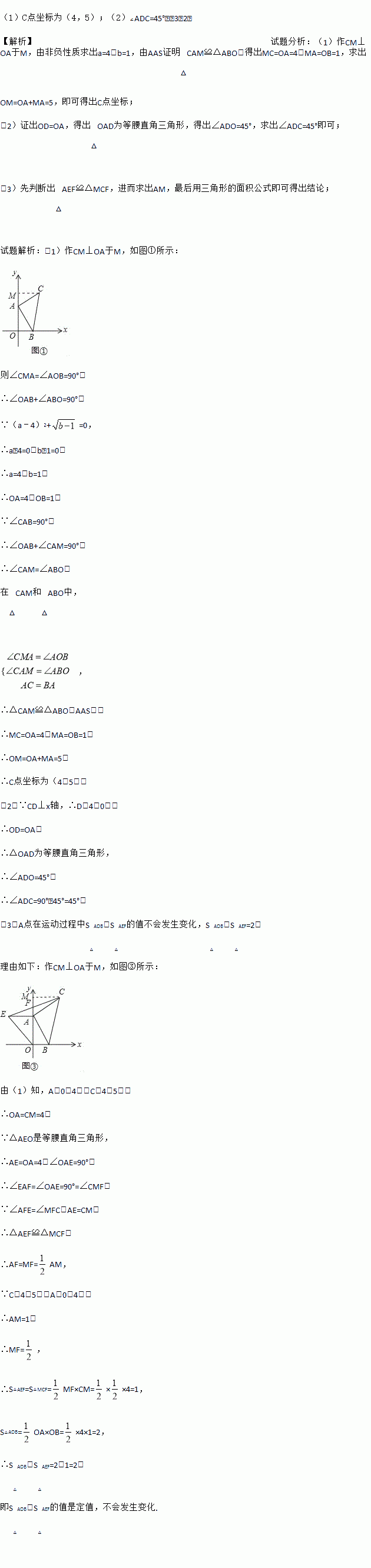 (1)C点坐标为(4,5);(2)∠ADC=45°;(3)2. 【解析】试题分析:(1)作CM⊥OA于M,由非负性质求出a=4,b=1,由AAS证明△CAM≌△ABO,得出MC=OA=4,MA=OB=1,求出OM=OA+MA=5,即可得出C点坐标; (2)证出OD=OA,得出△OAD为等腰直角三角形,得出∠ADO=45°,求出∠ADC=45°即可; (3)先判断出△AEF≌△MC...