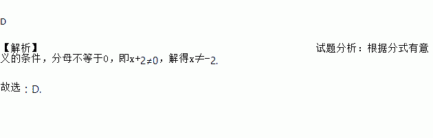 D 【解析】试题分析:根据分式有意义的条件,分母不等于0,即x+2≠0,解得x≠-2. 故选:D.