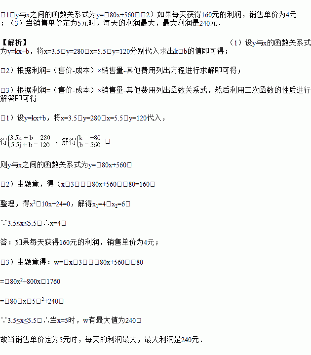 某大学生创业团队抓住商机,购进一批干果分装成营养搭配合理的小包装后出售,每袋成本3元.试销期间发现每天的销售量y(袋)与销售单价x(元)之间满足一次函数关系,部分数据如表所示,其中3.5≤x≤5.5,另外每天还需支付其他费用80元.