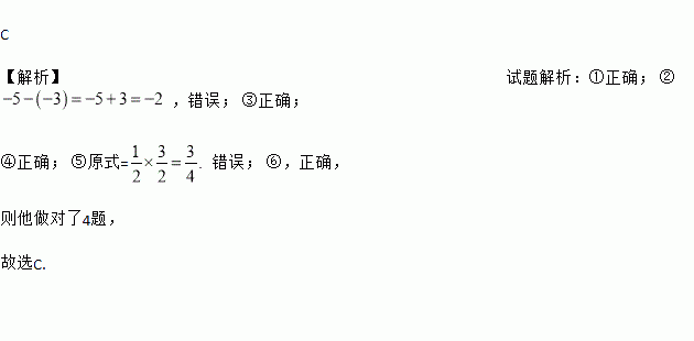 C 【解析】试题解析:①正确; ②,错误; ③正确; ④正确; ⑤原式= 错误; ⑥,正确, 则他做对了4题, 故选C.
