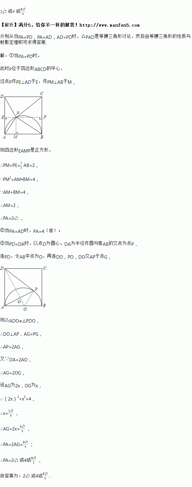 如图,已知四边形是边长为的正方形,以为直径向正方形内作半圆,为半圆上一动点(不与、重合),当________时,为等腰三角形.