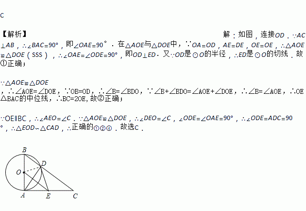 如下图,已知⊙O的直径为AB,AC⊥AB于点A, BC与⊙O相交于点D,在AC上取一点E,使得ED=EA.下面四个结论:①ED是⊙O的切线;②BC=2OE③△BOD为等边三角形;④△EOD ∽ △CAD,正确的是( )