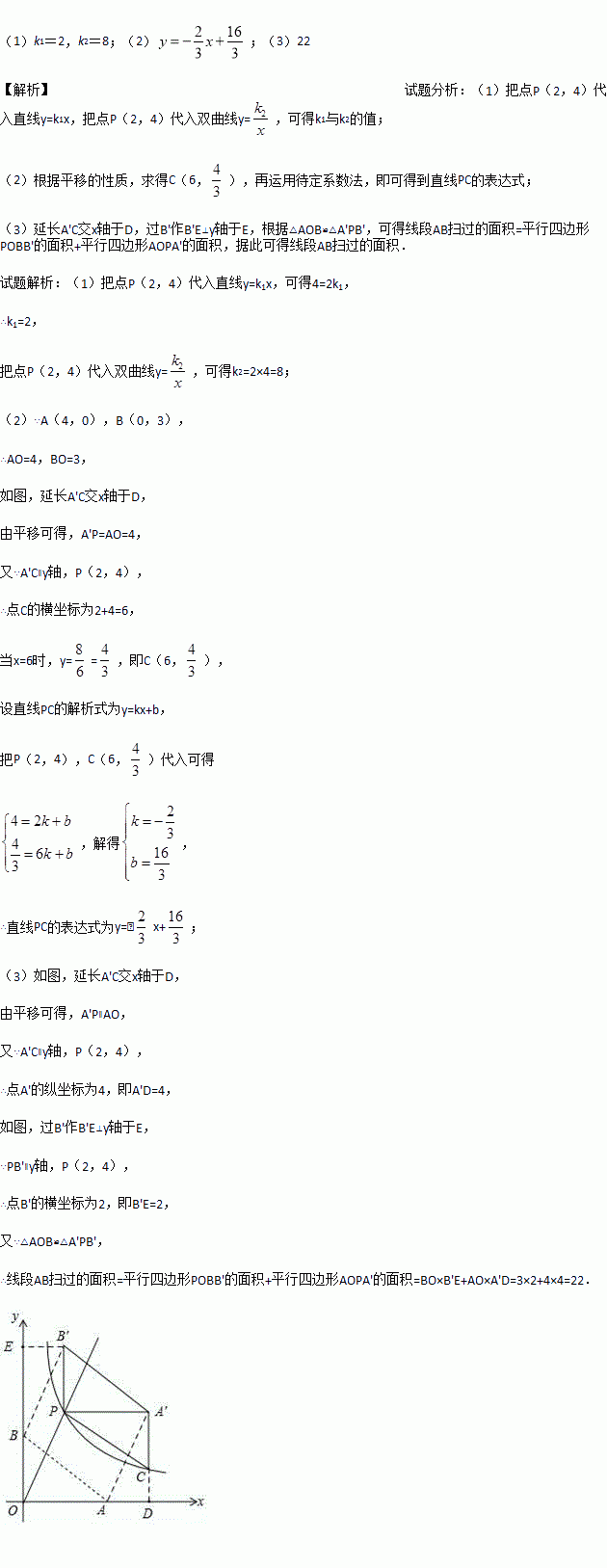 (x>0)相交于点P(2,4).已知点A(4,0),B(0,3),连接AB,将Rt△AOB沿OP方向平移,使点O移动到点P,得到△A′PB′.过点A′作A′C∥y轴交双曲线于点C,连接CP.