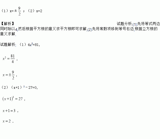 (1)4x2=81; (2)(x+1)3﹣27=0.