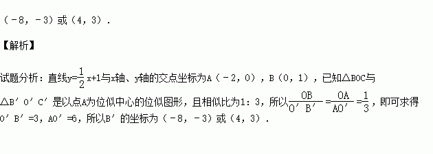 如图,直线y=x+1与x轴交于点A,与y轴交于点B,△BOC与△B′O′C′是以点A为位似中心的位似图形,且相似比为1:3,则点B的对应点B′的坐标为 .