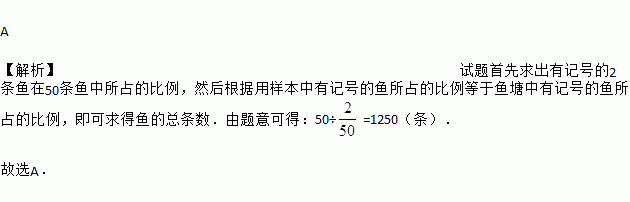 为估计鱼塘中鱼的数量,可以先从鱼塘中随机打捞50条鱼,在每条鱼身上做上记号后,把这些鱼放归鱼塘,经过一段时间,等这些鱼完全混合于鱼群后,再从鱼塘中随机打捞50条鱼,发现只有2条鱼是前面做好记号的,那么可以估计这个鱼塘中鱼的数量约为( )