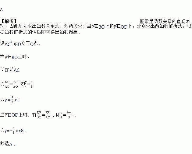 如图,在平行四边形ABCD中,AC=4,BD=6,P是BD上的任一点,过P作EF∥AC,与平行四边形的两条边分别交于点E、F.设BP=x,EF=y,则能反映y与x之间关系的图象为( )
