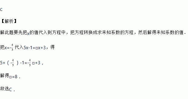 某同学解方程5x-1=□x+3时,把□处数字看错得x=-, 他把□处看成了( )