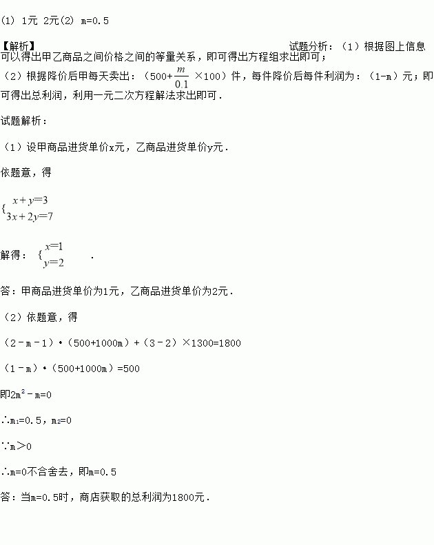 (2)已知甲、乙两种商品的零售单价分别为2元、3元,该商店平均每天卖出甲商品500件和乙商品1300件,经市场调查发现,甲种商品零售单价每降0.1元,甲种商品每天可多销售100件,商店决定把甲种商品的零售单价下降m(m>0)元,在不考虑其他因素的条件下,求当m为何值时,商店每天销售甲、乙两种商品获取的总利润为1800元(注:单件利润=零售单价﹣进货单价)