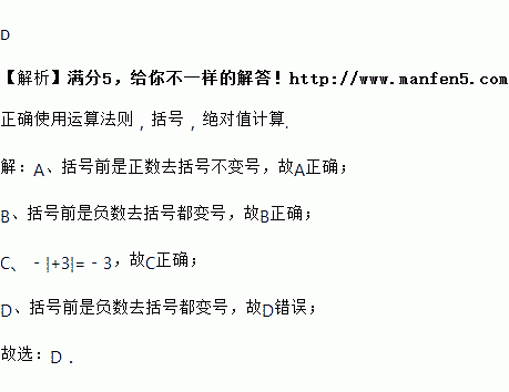 A. +(﹣5)=﹣5 B. ﹣(﹣0.5)=0.5 C. ﹣|+3|=﹣3 D. ﹣(+1)=1
