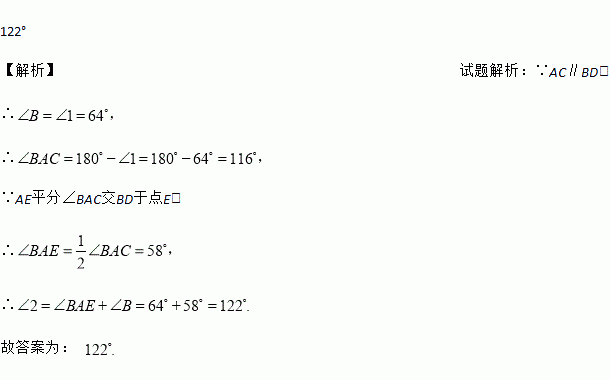 如图所示, ,AE平分∠BAC交BD于点E,若∠1=64°,则∠2的度数为_____.