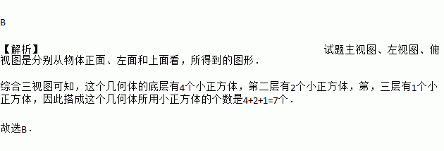已知:如图,是由若干个大小相同的小正方体所搭成的几何体的三视图,则搭成这个几何体的小正方体的个数是( )