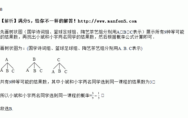 岐山县各学校开展了第二课堂的活动,在某校国学诗词组、篮球足球组、陶艺茶艺组三个活动组织中,若小斌和小宇两名同学每人随机选择其中一个活动参加,则小斌和小宇选到同一活动的概率是( )