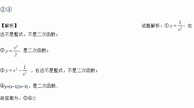在函数式①y= , ②y= , ③y=x2﹣, ④y=(x﹣1)(x﹣3)中,二次函数是________ (填序号).