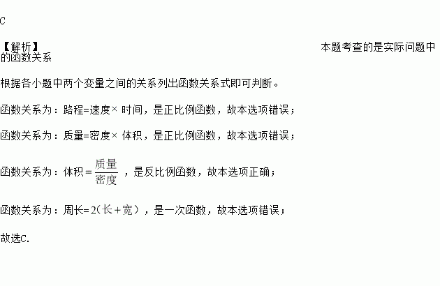 C.质量一定时,物体的体积与密度的关系 D.长方形的长一定时,它的周长与宽的关系