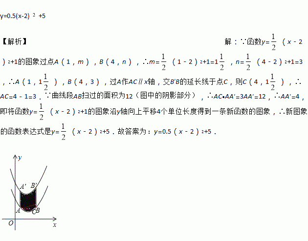 (x-2)2+1的图像沿y轴向上平移得到一条新的二次函数图像,其中A(1,m),B(4,n)平移后对应点分别是A′、B′,若曲线AB所扫过的面积为12(图中阴影部分),则新的二次函数对应的函数表达是__________________.