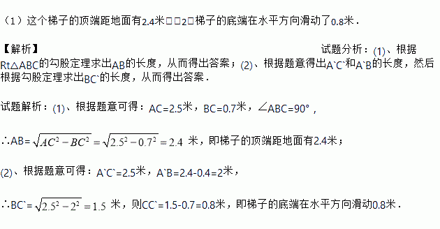 (2)如果梯子的顶端下滑了0.4米到A′,那么梯子的底端在水平方向滑动了几米?