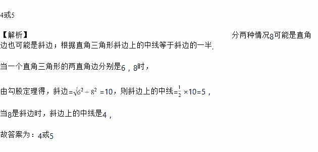如果一个直角三角形的两边分别是6,8,那么斜边上的中线是___________.