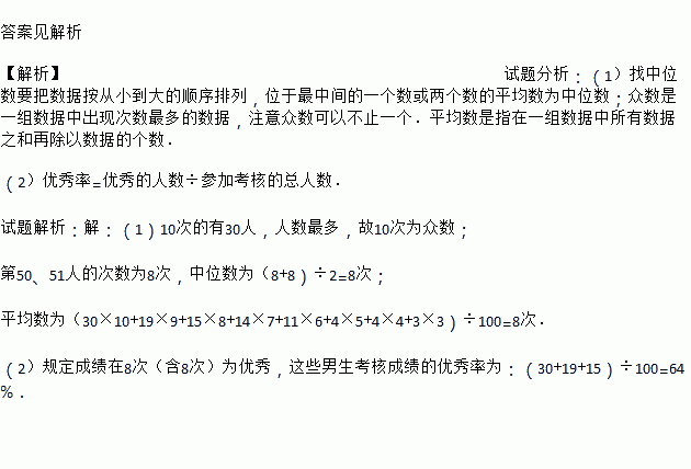 (2)规定成绩在8次(含8次)为优秀,求这些男生考核成绩的优秀率。