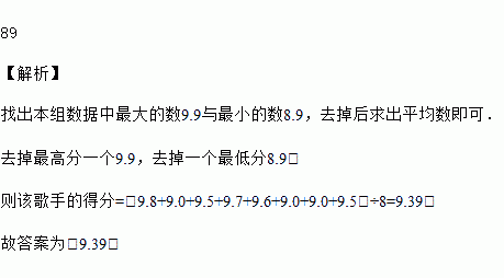 在某次歌手大赛中,10位评委对某歌手打分分别为:9.8,9.0,9.5,9.7,9.6,9.0,9.0,9.5,9.9,8.9,则去掉一个最高分一个最低分后,该歌手的得分应是__________。
