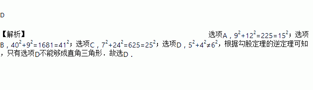 A. 9、12、15 B. 41、40、9 C. 25、7、24 D. 6、5、4