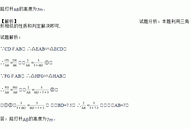 如图,花丛中有一路灯杆AB,在灯光下,大华在D点处的影长DE=3米,沿BD方向行走到达G点,DG=5米,这时大华的影长GH=5米.如果大华的身高为2米,求路灯杆AB的高度.