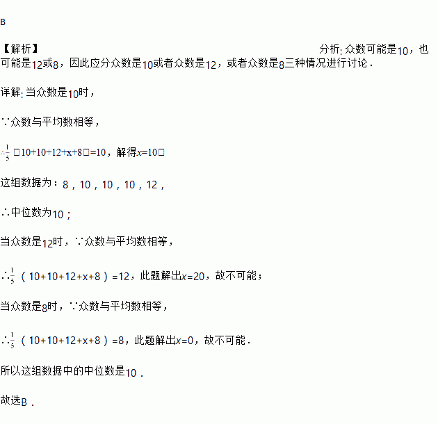初三•一班五个劳动竞赛小组一天植树的棵数是:10,10,12,x,8,如果这组数据的众数与平均数相等,那么这组数据的中位数是( )