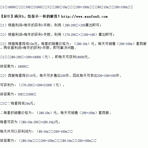 (3)若每套西服售价降低10x元,则每套西服的售价为 元,每天可以销售西服 套,共可获利 元.(用含x的代数式表示)