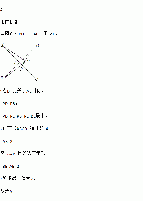如图,正方形ABCD的面积为4,△ABE是等边三角形,点E在正方形ABCD内,在对角线AC上有一点P,使PD+PE的和最小,则这个最小值为( )