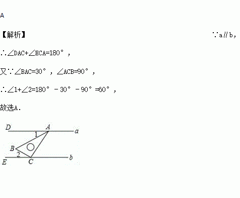 如图,在平行线a,b之间放置一块直角三角板,三角板的顶点A,C分别在直线a,b上,∠ACB=90°,∠BAC=20°,则∠1+∠2的值为( )