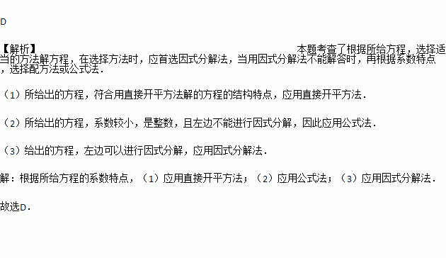 D. (1)直接开平方法(2)公式法(3)因式分解法