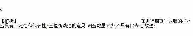 C 【解析】在进行调查时选取的样本应具有广泛性和代表性,”三位游戏迷的意见”调查数量太少,不具有代表性,故选C.