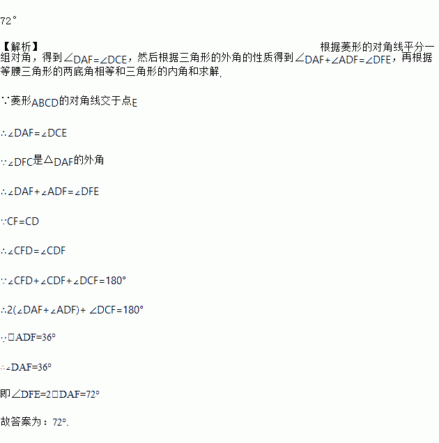如图,E是菱形ABCD的对角线的交点,点F在线段AE上,且CF=CD,若∠ADF=36°,则∠CFD=_______