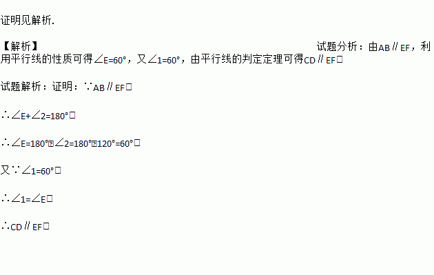 如图,AB∥EF,∠1=60°,∠2=120°,试说明CD∥EF.