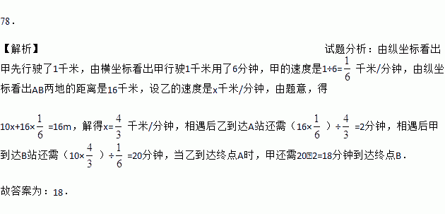 甲、乙两人在一条笔直的道路上相向而行,甲骑自行车从A地到B地,乙驾车从B地到A地,他们分别以不同的速度匀速行驶,已知甲先出发6分钟后,乙才出发,在整个过程中,甲、乙两人的距离y(千米)与甲出发的时间x(分)之间的关系如图所示,当乙到达终点A时,甲还需________分钟到达终点B.