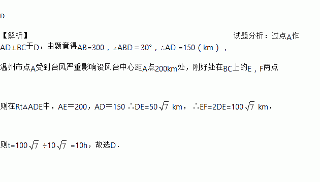 千米的速度向东偏南30°的BC方向移动,并检测到台风中心在移动过程中,温州市A将受到影响,且距台风中心200千米的范围是受台风严重影响的区域.则影响温州市A的时间会持续多长?( )