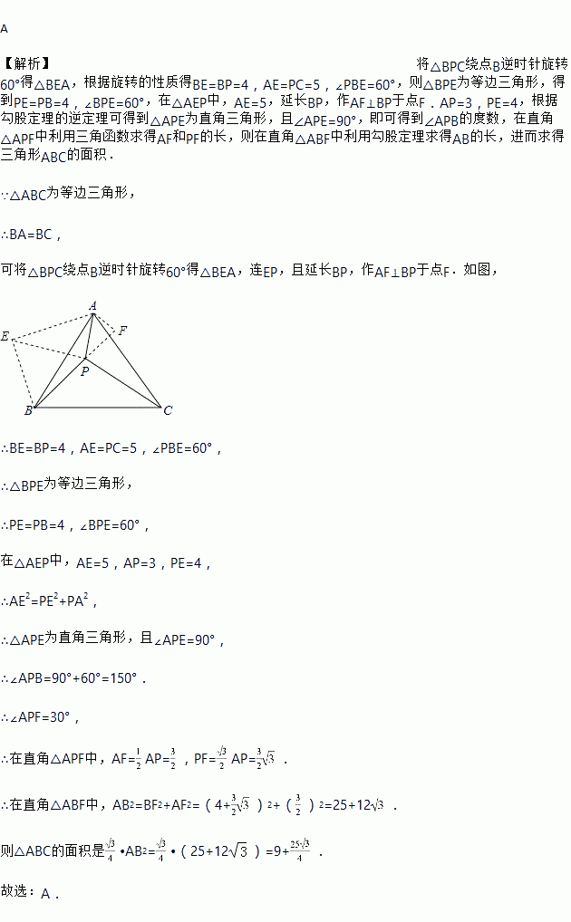 如图,P为等边三角形ABC内的一点,且P到三个顶点A,B,C的距离分别为3,4,5,则△ABC的面积为( )
