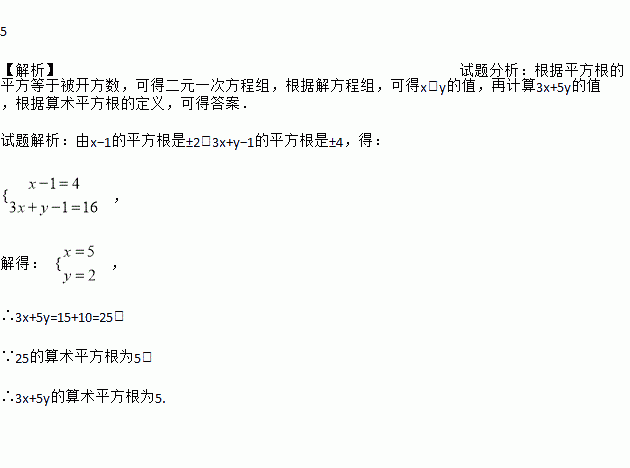 5 【解析】试题分析:根据平方根的平方等于被开方数,可得二元一次方程组,根据解方程组,可得x、y的值,再计算3x+5y的值,根据算术平方根的定义,可得答案. 试题解析:由x?1的平方根是±2,3x+y?1的平方根是±4,得: , 解得: , ∴3x+5y=15+10=25, ∵25的算术平方根为5, ∴3x+5y的算术平方根为5.