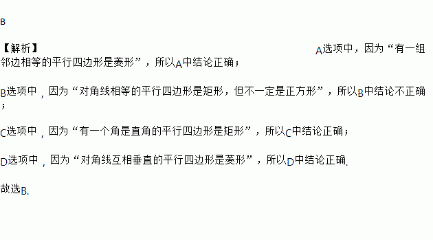 B 【解析】A选项中,因为“有一组邻边相等的平行四边形是菱形”,所以A中结论正确; B选项中,因为“对角线相等的平行四边形是矩形,但不一定是正方形”,所以B中结论不正确; C选项中,因为“有一个角是直角的平行四边形是矩形”,所以C中结论正确; D选项中,因为“对角线互相垂直的平行四边形是菱形”,所以D中结论正确. 故选B.