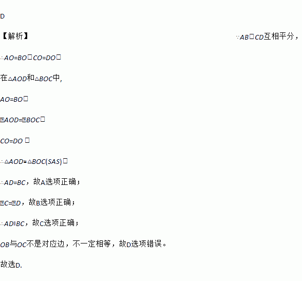 A. AD=BC B. ∠C=∠D C. AD∥BC D. OB=OC
