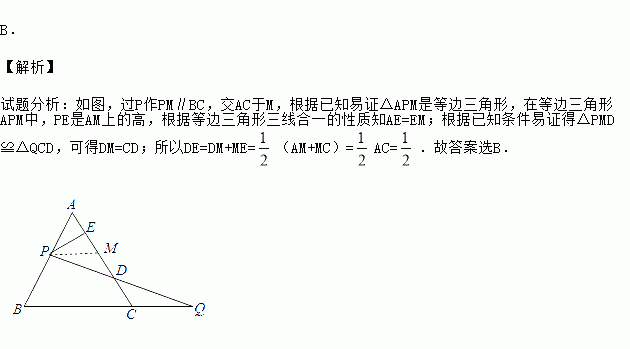 如图,过边长为1的等边△ABC的边AB上一点P,作PE⊥AC于E,Q为BC延长线上一点,当PA=CQ时,连PQ交AC边于D,则DE的长为 ( )
