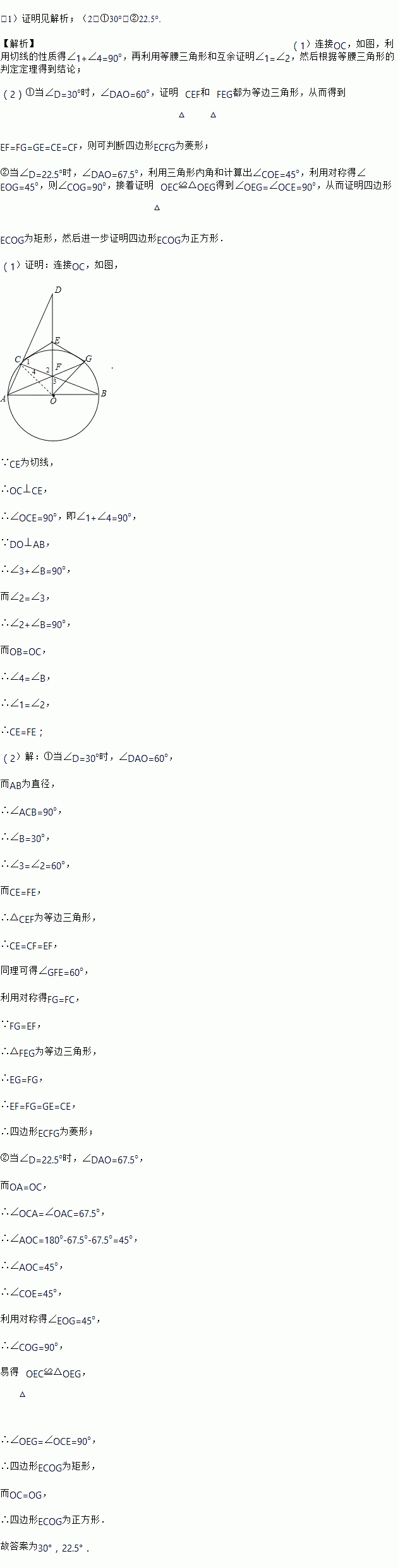 ②当∠D的度数为 时,四边形ECOG为正方形.