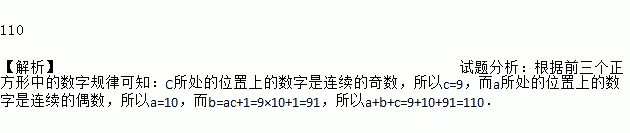 110 【解析】试题分析:根据前三个正方形中的数字规律可知:C所处的位置上的数字是连续的奇数,所以c=9,而a所处的位置上的数字是连续的偶数,所以a=10,而b=ac+1=9×10+1=91,所以a+b+c=9+10+91=110.