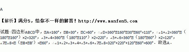 如图,四边形ABCD纸片中,已知∠A=160°,∠B=30°,∠C=60°,四边形ABCD纸片分别沿EF,GH,OP,MN折叠,使A与A′、B与B′、C与C′、D与D′重合,则∠1+∠2+∠3+∠4+∠5+∠6+∠7﹣∠8的值是( )