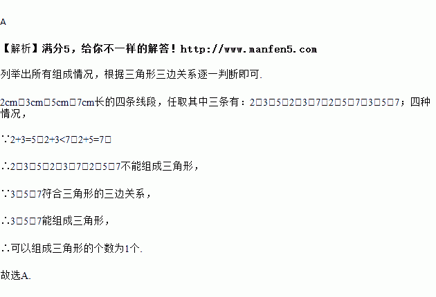 现有2cm,3cm,5cm,7cm长的四条线段,任取其中三条,可以组成的三角形的情况个数是( )
