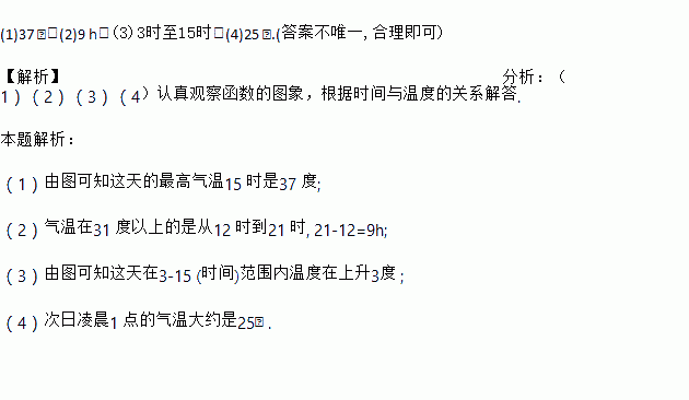 (1)37 ℃;(2)9 h;(3)3时至15时;(4)25 ℃.(答案不唯一,合理即可) 【解析】分析:(1)(2)(3)(4)认真观察函数的图象,根据时间与温度的关系解答. 本题解析: (1)由图可知这天的最高气温15 时是37 度; (2)气温在31 度以上的是从12 时到21 时, 21-12=9h; (3)由图可知这天在3-15 (时间)范围内温度在上升3度...