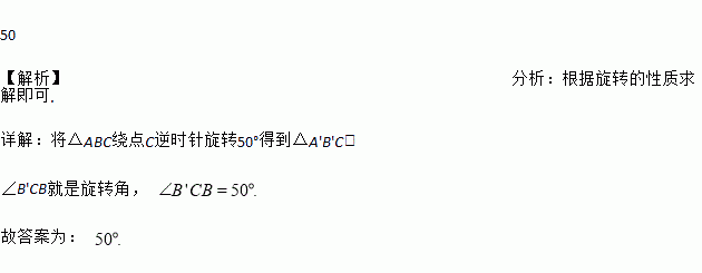 如下图,将△ABC绕点C逆时针旋转50°得到△A'B'C,则∠B'CB的大小为________°.